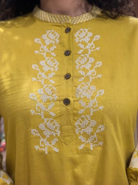 Kurta: Pure cotton (60-60 super dyeing) fabric with intricate embroidered yoke, adding a touch of timeless elegance.