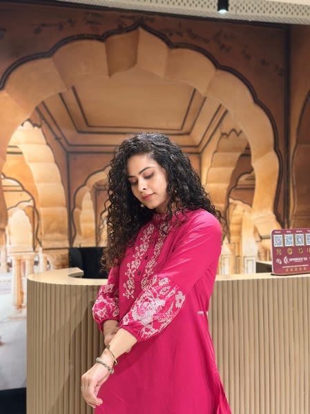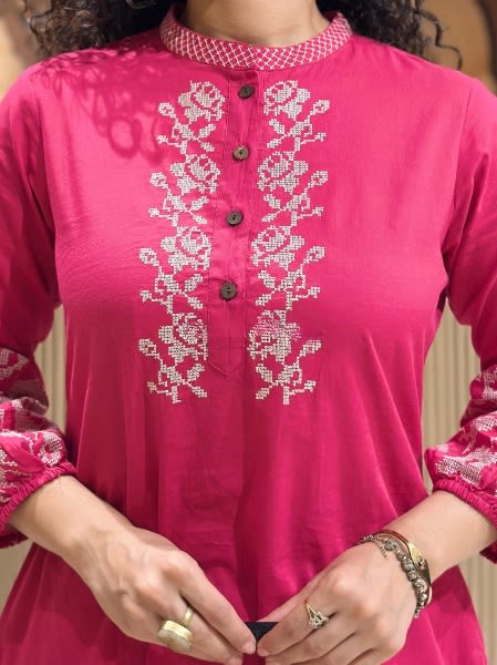 Elegant Handloom Embroidered Kurti Set With Linen Dupatta Pink