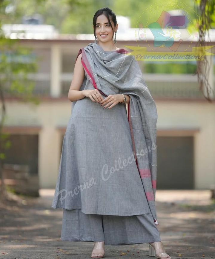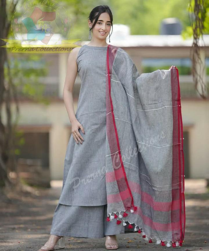 Cream Khadi Cotton Kurti Set With Dupatta For Women