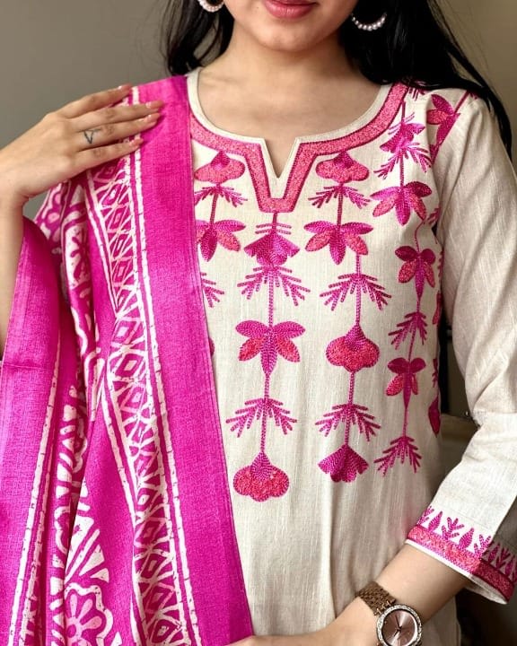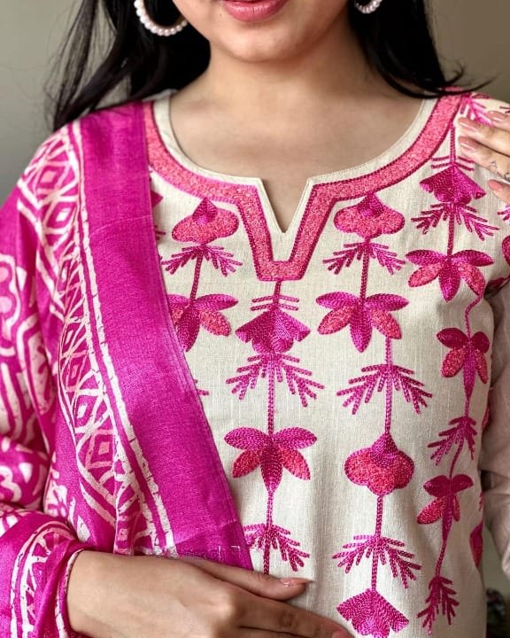 Elegant Handloom Embroidered Kurti Set With Linen Dupatta Pink