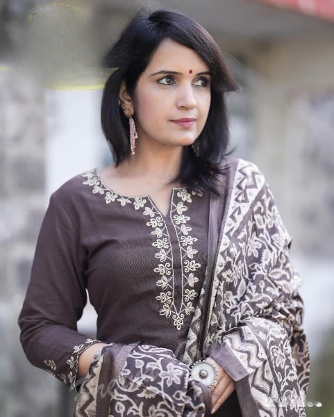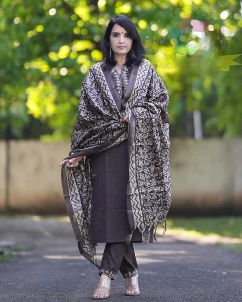 Brown Flaired Embroidered Cotton 3-Piece Suit