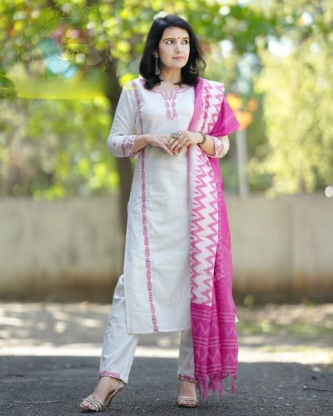 Elegant Handloom Embroidered Kurti Set With Linen Dupatta Pink